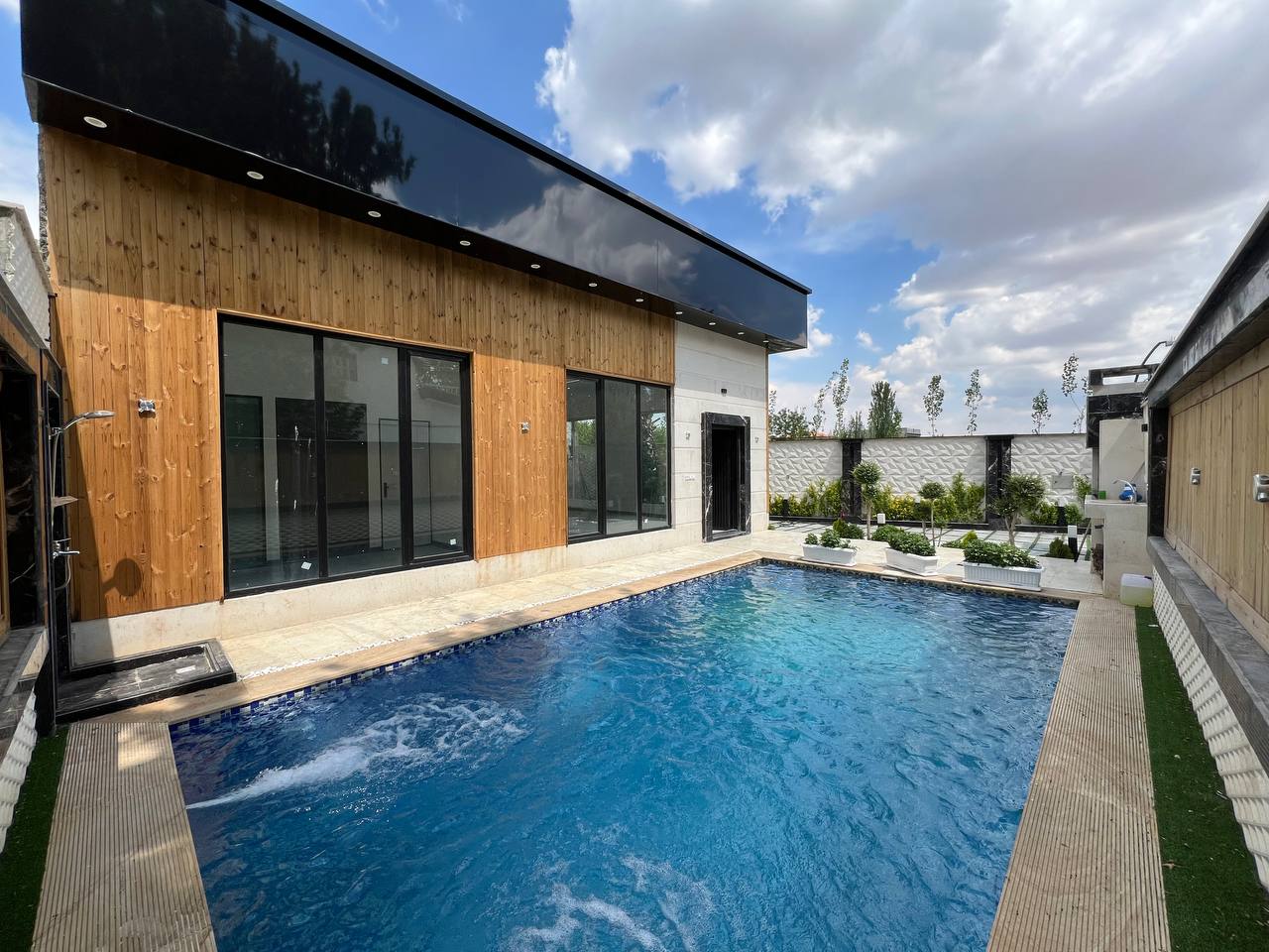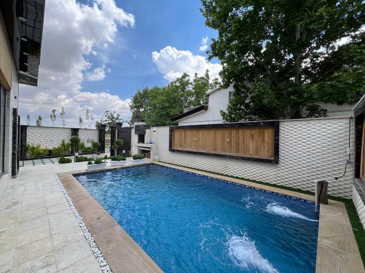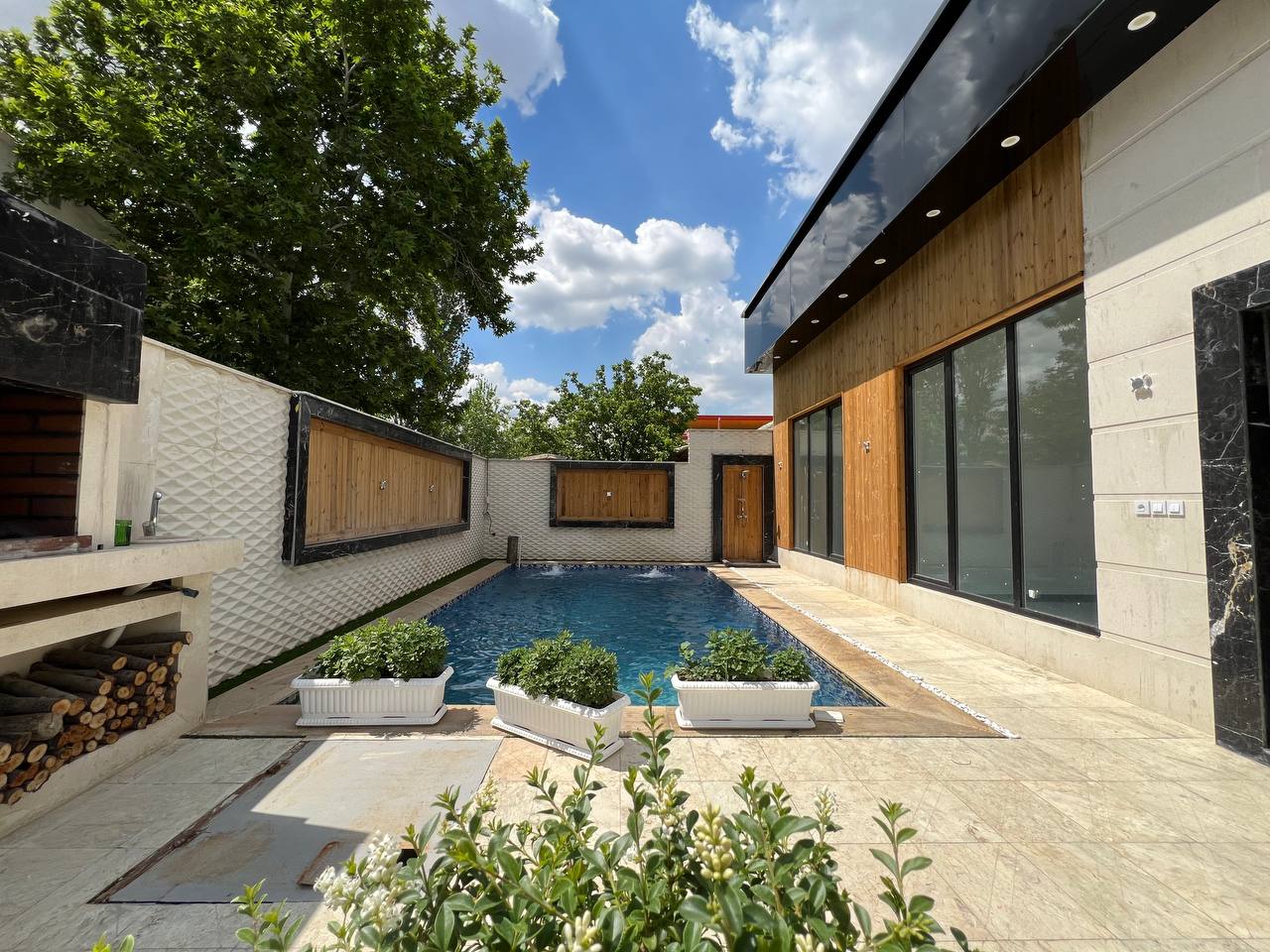 فضای بیرون و محوطه سازی این ویلا نیز بسیار شیک و با متریال های مرغوب ساخته شده است. از امکانات این ویلا می توان به استخر چهار فصل با تاسیسات هوشمند و باربیکیو آلاچیق اشاره کرد. این ویلای زیبا تمامی امکانات رفاهی یک ویلای مجهز را برای تفریح و گذران اوغات خوش شما و دوستانتان را دارد.